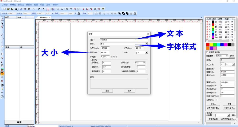 輸入文本(包括數(shù)字、字母、文字等),選擇字體樣式、大小,再點擊“添加”