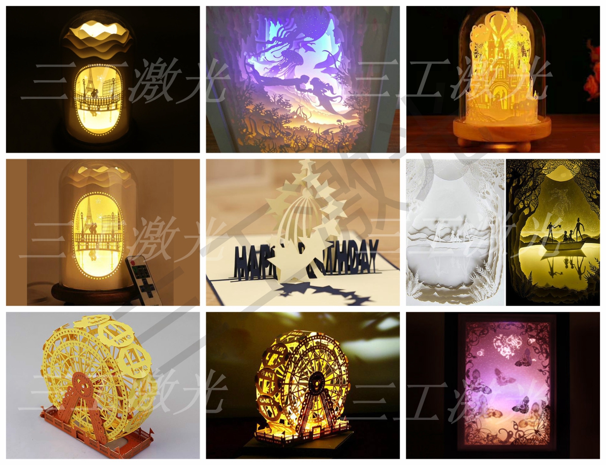 紙本來是極為樸素的媒介,然而讓人驚訝的是,加上光與影的結(jié)合,居然呈現(xiàn)出這樣神秘而夢幻的畫面。光影紙雕燈將中國傳統(tǒng)元素的剪紙與皮影,以及現(xiàn)代的審美與設(shè)計(jì),巧妙又和諧的融合在一起了。而3D紙雕燈,更是在傳統(tǒng)2D紙雕燈的基礎(chǔ)上進(jìn)行了突破,通過層疊的紙雕圖案,讓原本樸素的紙張,在光影之下,呈現(xiàn)出神秘而又夢幻的畫面。很多人熱衷于采用手工制作的方式來之多紙雕燈,優(yōu)點(diǎn)在于自己動(dòng)手,可以體驗(yàn)制作的樂趣,成品也顯得很有意義,缺點(diǎn)在于制作費(fèi)時(shí)費(fèi)力,而且圖案要求制作的很精細(xì)。那么對于大批量的生產(chǎn)來講,必定要穩(wěn)定性好,效率高的機(jī)器才能滿足生產(chǎn)需求!而光影紙雕燈激光鏤空機(jī)既是這樣一個(gè)存在。