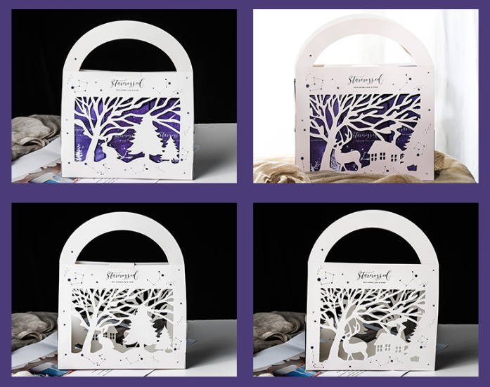 隨著時代的變遷,賀卡也跟著“與時俱進(jìn)”了。那種風(fēng)格千篇一律古板單一的賀卡已經(jīng)逐漸淡出歷史的舞臺。賀卡激光鏤空機(jī)進(jìn)行雕刻加工無需開刀模,快速成型,切口平整,圖形可任意形狀,賀卡激光雕刻加工具有很強(qiáng)的立體感,且賀卡激光雕刻加工款式新穎。賀卡激光鏤空機(jī)具有加工精度高、自動化程度高、加工速度快、加工效率高、操作簡單方便等特點(diǎn),適應(yīng)了紙品生產(chǎn)技術(shù)潮流,所以激光鏤空加工技術(shù)正在以驚人的速度在紙品行業(yè)內(nèi)得到推廣和普及??梢詮氐卓朔鹘y(tǒng)喜帖賀卡印刷耗時、不環(huán)保的這些缺點(diǎn)。