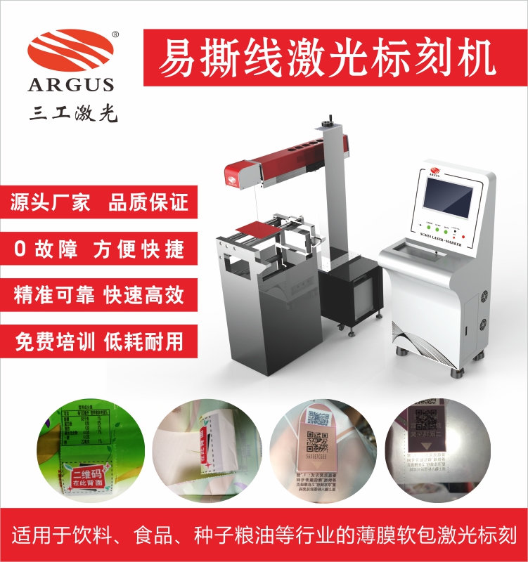 激光標(biāo)刻易撕線技術(shù)的應(yīng)用越來越普遍,廣泛的行業(yè)應(yīng)用促使激光加工技術(shù)飛速發(fā)展,激光刻線在薄膜軟包易撕線加工上的應(yīng)用也是日新月異,激光加工成為了PE、PVC、PET薄膜加工行業(yè)新型的工藝領(lǐng)導(dǎo)者。武漢三工激光是國內(nèi)率先針對(duì)薄膜包裝行業(yè)提出激光代替機(jī)械加工工藝的企業(yè),專為薄膜易撕線、定量透氣孔設(shè)計(jì),打標(biāo)速度快,設(shè)備易操作,性能穩(wěn)定,使用壽命長等。SCM-55集合了激光技術(shù)、光學(xué)技術(shù)、精密機(jī)械、電子技術(shù)、計(jì)算機(jī)軟件技術(shù)以及制冷等學(xué)科于一體的高科技產(chǎn)品,與傳統(tǒng)的機(jī)械齒輪壓孔相比速度更快,孔徑孔距大小可調(diào)更加均勻,可實(shí)現(xiàn)任意方向、形狀,多條易撕線標(biāo)刻。