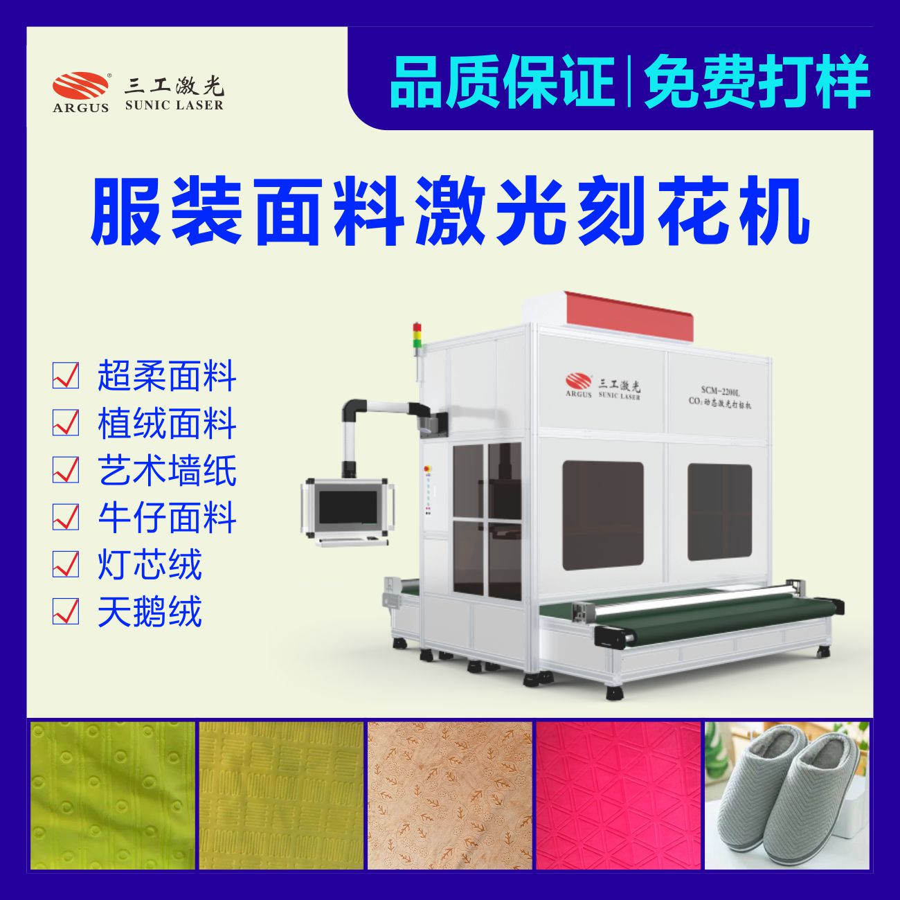 服裝面料激光打標機該設備是利用激光的熱效應,無接觸的對面料進行燒灼刻蝕,并形成凸凹有致的花型圖案。適用于服裝、箱包、紡織、家居、酒店、廣告、會展裝飾、汽車裝飾等行業(yè)。適用于超柔面料、植絨面料、藝術墻紙、牛仔面料、燈芯絨、天鵝絨等多種面料。