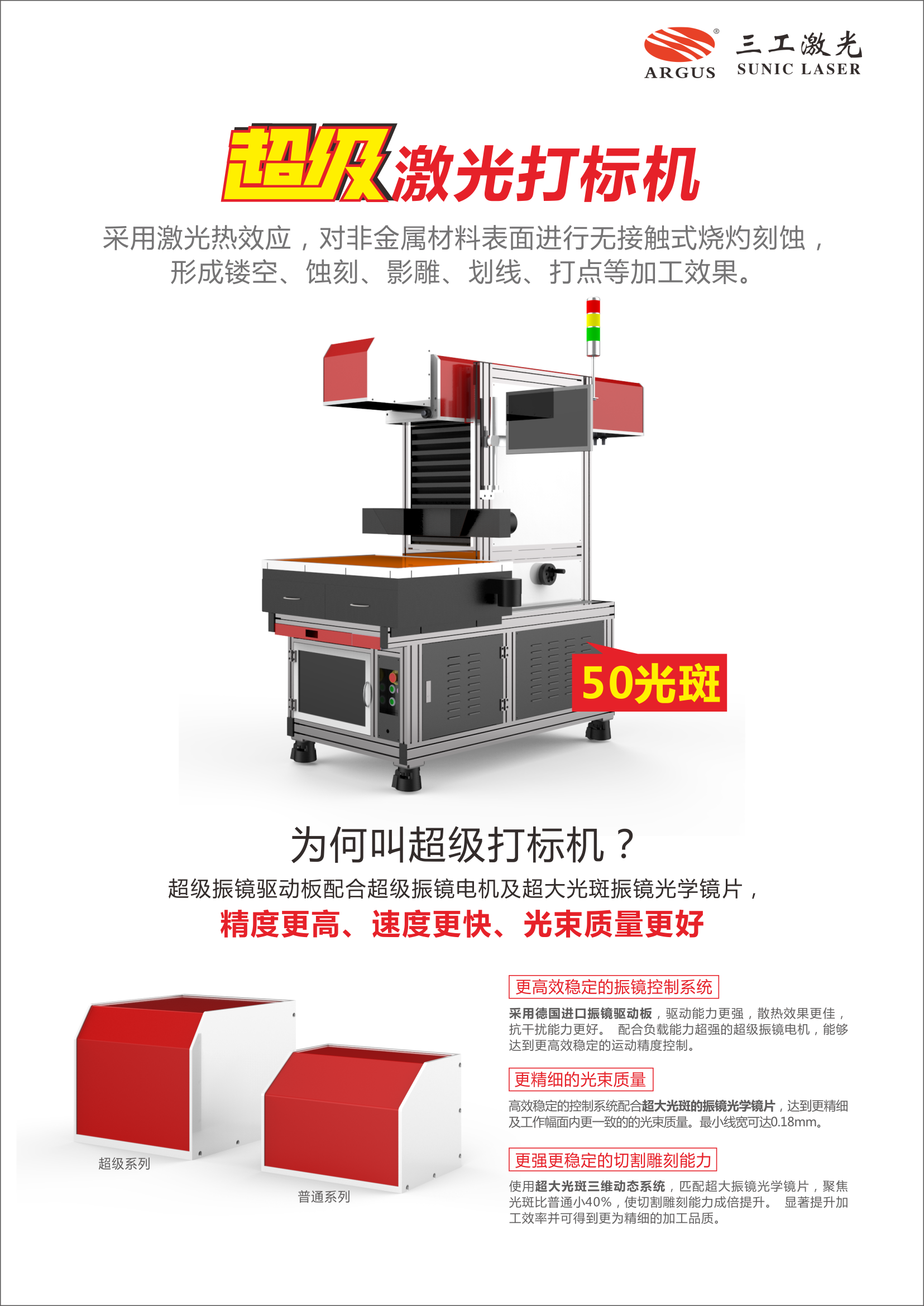 相對于之前的設(shè)備而言,超級激光打標(biāo)機采用50光斑振鏡,在對各種材料的雕刻切割能力上都有了極大的提升,速度更快、動力更足。該設(shè)備采用激光熱效應(yīng),對非金屬材料表面進行無接觸式燒灼刻蝕,形成鏤空、蝕刻、影雕、劃線、打點等加工效果。超級振鏡驅(qū)動板配合超級振鏡電機及超大光斑振鏡光學(xué)鏡片,精度更高、速度更快、光束質(zhì)量更好。