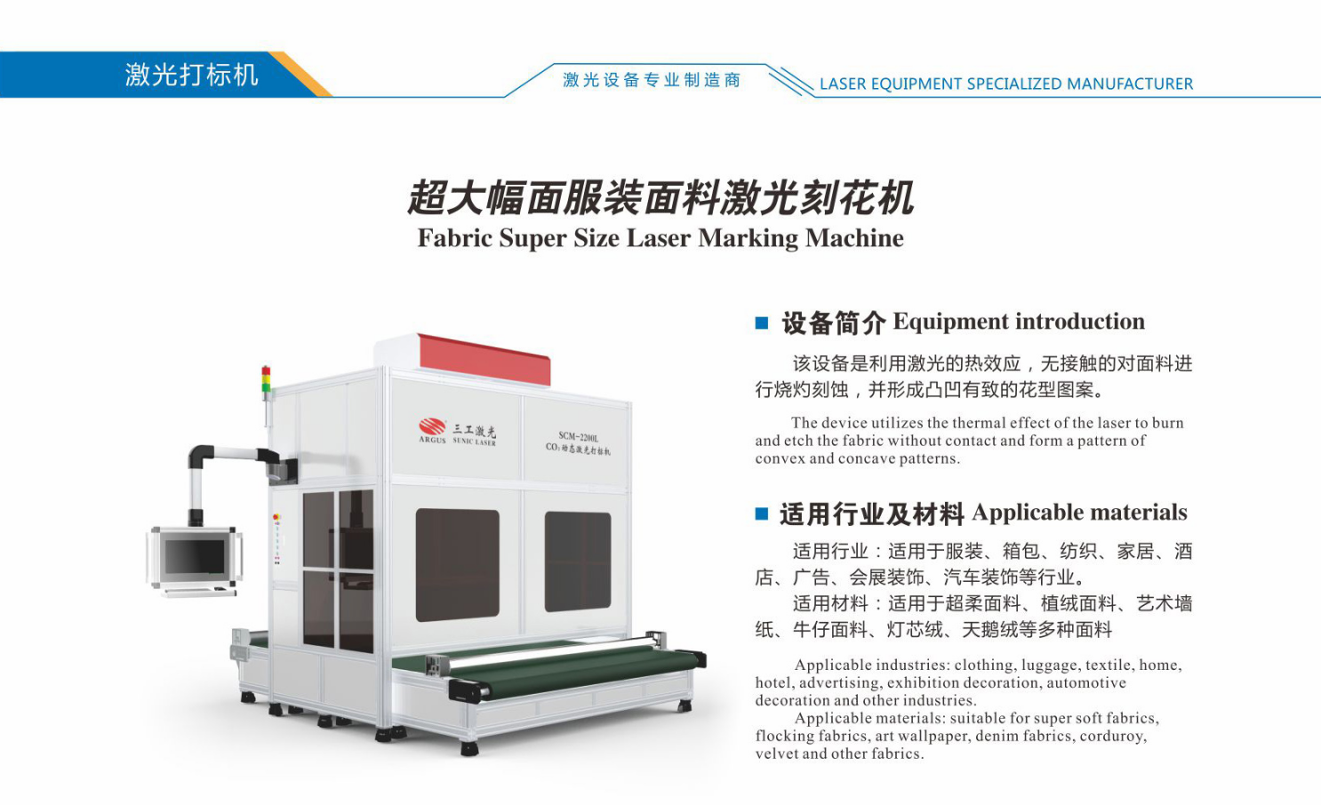 激光雕花機該設(shè)備是利用激光的熱效應(yīng),無接觸的對面料進行燒灼刻蝕,并形成凸凹有致的花型圖案。適用于服裝、箱包、紡織、家居、酒店、廣告、會展裝飾、汽車裝飾等行業(yè)。適用于超柔面料、植絨面料、藝術(shù)墻紙、牛仔面料、燈芯絨、天鵝絨等多種面料