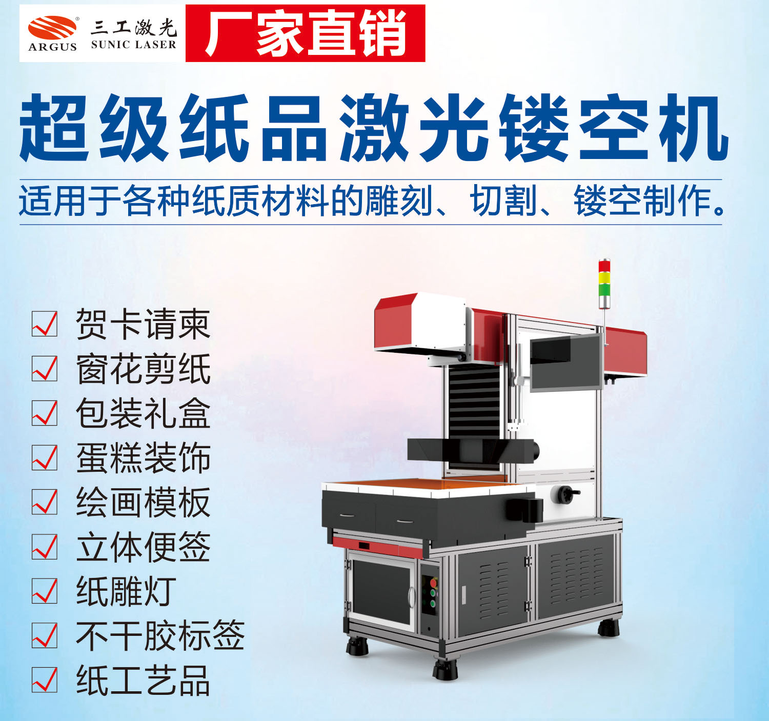 激光鏤空造型豐富的圖案,或者是節(jié)日主題定制的造型,現(xiàn)在被廣泛用于各類印刷制品節(jié)日禮品等。因為激光鏤空模切特有的不接觸加工物體的特征,使得各類印刷品在進行圖案模切的時候不會出現(xiàn)變形、切不斷等現(xiàn)象,并且在穩(wěn)定機器性能下,不會出現(xiàn)焦邊、糊邊、發(fā)黃等現(xiàn)象,隨著市場上的需求量增加,三工激光的紙品激光鏤空機已經(jīng)被廣泛應(yīng)用于工業(yè)化大批量生產(chǎn)?!?/span>