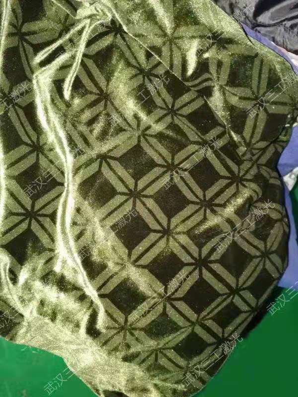 燒花,是指花型通過經(jīng)線和緯線織出來的,然后再運用激光雕刻的方式,雕刻出立體花型的制作工藝。即利用激光的高能量密度特性,將花型“燒”出立體感。它的特點是檔次較高,切邊自動熔合,無散口現(xiàn)象。燒花工藝制作的花型像從空中飄來般自然,既真實又具有豐富的層次感。