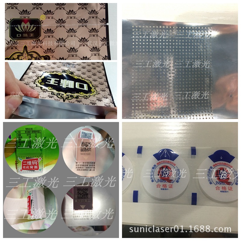 武漢三工激光包裝袋激光打孔機(jī)的存在可以解決很多氣動打孔以及齒輪壓孔不能實現(xiàn)的技術(shù)要求,不管是內(nèi)部裝有液體 的復(fù)合包裝袋,還是外部需要防潮透氣的包裝皆適用。超細(xì)透氣孔專用設(shè)備 小孔徑0.1-0.3mm 小孔間距0.3mm防水透氣,孔距大小均勻,任意方向 任意形狀,速度快,可以配合分切機(jī)、制袋機(jī)、合掌機(jī)等機(jī)器使用。
