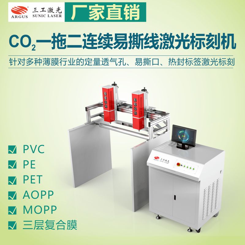 易撕線激光打標(biāo)機(jī)(易撕線激光劃線打孔機(jī)),擁有超細(xì)透氣孔專用設(shè)備,實(shí)現(xiàn)虛線孔、透氣孔、易撕口、熱封標(biāo)簽激光標(biāo)刻等需求,最小孔徑0.1~0.3mm,能夠有效的防水且透氣。實(shí)現(xiàn)任意方向(不局限于直線)、任意形狀的標(biāo)刻,具有速度快、性能穩(wěn)定、安全可靠的特性,一般搭配分切機(jī)、制袋機(jī)、合掌機(jī)等相關(guān)設(shè)備配套使用。主要是為了滿足現(xiàn)代化商品包裝的需求以及解決傳統(tǒng)虛線打孔中存在的問題,專為薄膜易撕線、定量透氣孔設(shè)計,打標(biāo)速度快,設(shè)備易操作,性能穩(wěn)定,使用壽命長等。與傳統(tǒng)的機(jī)械齒輪壓孔相比速度更快,孔徑孔距大小可調(diào)更加均勻,可以實(shí)現(xiàn)任意方向任意形狀易撕孔標(biāo)刻。