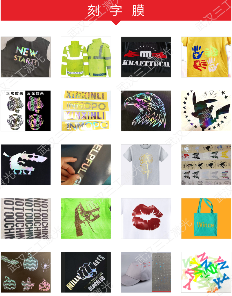 鐳射刻字膜有很多優(yōu)點,比如光亮奪目、色彩變幻、五彩繽紛,有著金屬的質感,完全遮蓋原有服裝顏色;加工快捷無需制版,省去制版的時間和費用,立等可取,節(jié)約人力物力;成卷的包裝,讓你想刻多少就刻多少,最大程度利用邊角材料,避免浪費,成本可控;耐揉搓,耐水洗;高低溫環(huán)境下不開膠,不斷裂,耐紫外線和陽光不掉色;該膜所用材料均為環(huán)保材料;可套色轉印,以增加承應物的豐富性和變化性,且不受限于布料的顏色,只要是布料材質皆可轉印,轉印后具有優(yōu)越的洗水色牢度及膠粘牢度。使用刻字膜先通過激光打標機進行雕刻后再撕離多余的部分,通過燙畫機燙印在布料上面,流程操作簡單快捷。