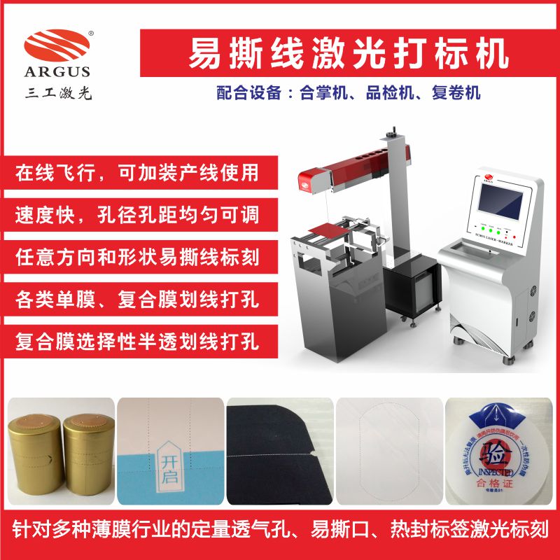 商品包裝或者包裝的表面總是有一層塑料薄膜來保護(hù)商品以免受潮或者污染,為了便于打開,經(jīng)常有設(shè)計(jì)的有易撕口或者虛線孔,這一小小的設(shè)計(jì)給生活帶來了便利。經(jīng)常會看到一些物品采用薄膜軟包,上面有一排小小的透氣孔,例如常見的電子產(chǎn)品充電器上,一層薄薄的軟薄膜,淺淺的一排定量透氣孔。定量透氣孔采用激光打孔,便捷快速,效果好。三工激光定量透氣孔激光打孔機(jī),以其優(yōu)越的加工特性,成為很多商家的選擇。三工激光易撕線激光刻線機(jī)主要用于不同材質(zhì)的塑料包裝袋 ,例如PE、PVC、PET等各種薄膜材質(zhì)??捎糜陲嬈凤嬃?、文化用品、五金工具、日用百貨、電子電器、金屬制品等行業(yè)的定量透氣孔、易撕口、熱封標(biāo)簽等激光標(biāo)刻。