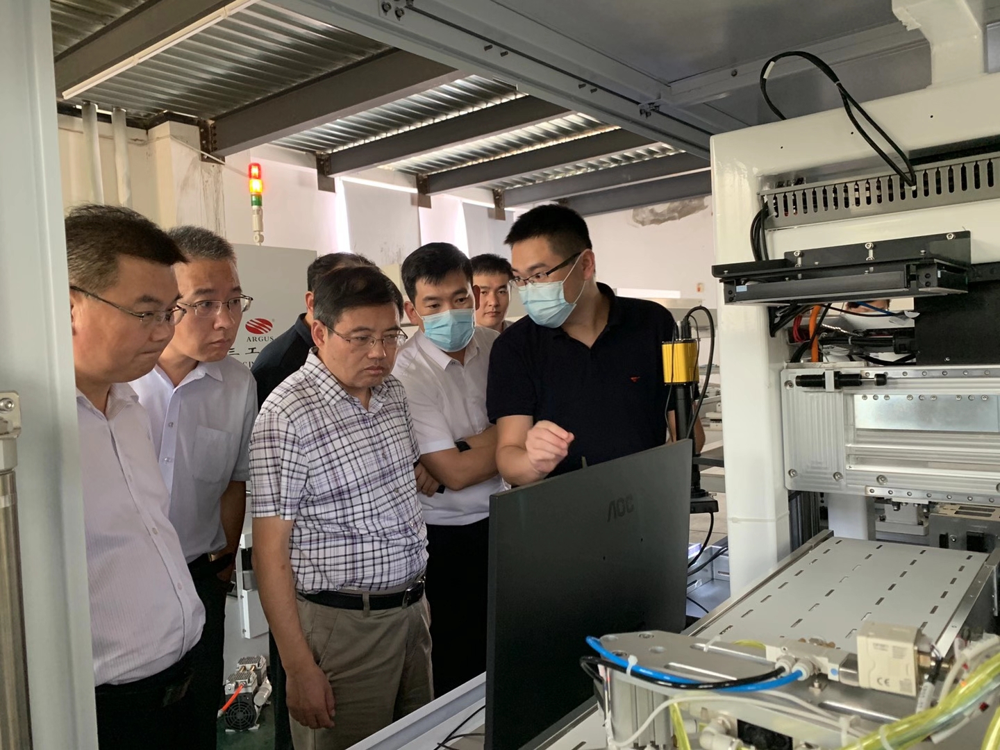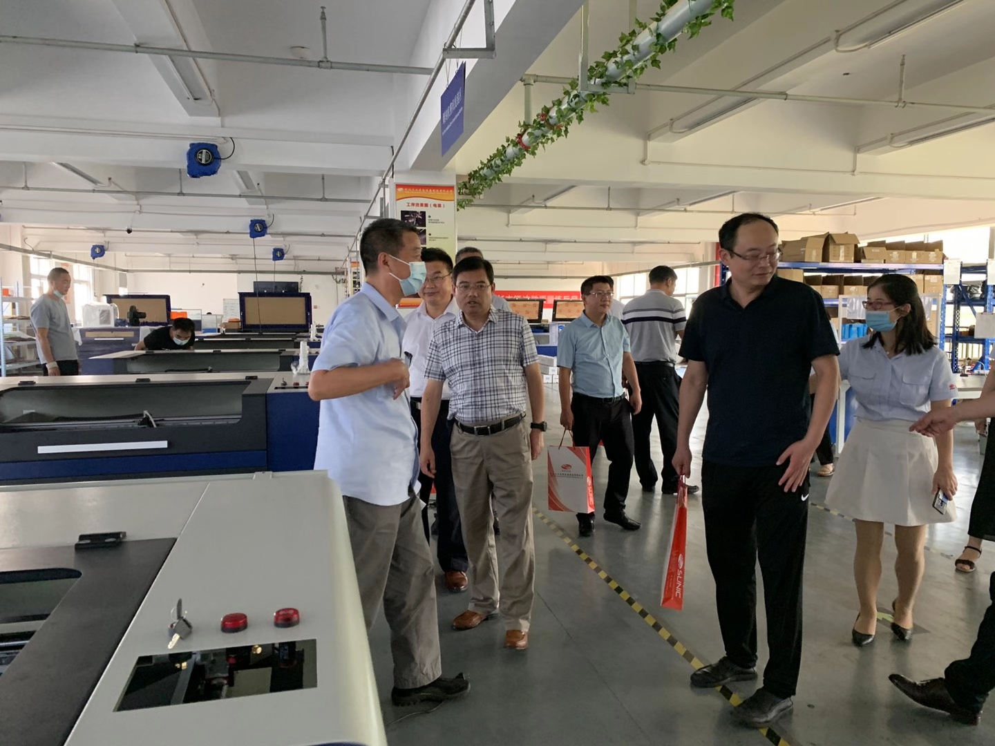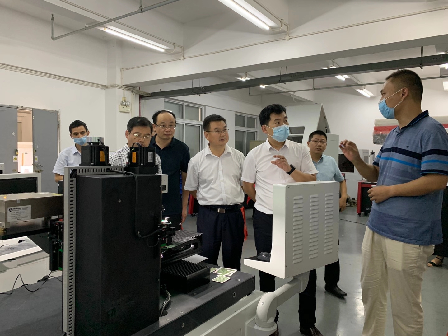 2020年9月2日山東省臨沂市國(guó)有資產(chǎn)投資控股集團(tuán)有限公司黨委書記、董事長(zhǎng)魯峰武,臨沂經(jīng)濟(jì)技術(shù)開發(fā)區(qū)黨工委委員、管委會(huì)副主任楊振魁等一行考察團(tuán)蒞臨武漢三工光電設(shè)備制造有限公司參觀指導(dǎo)。